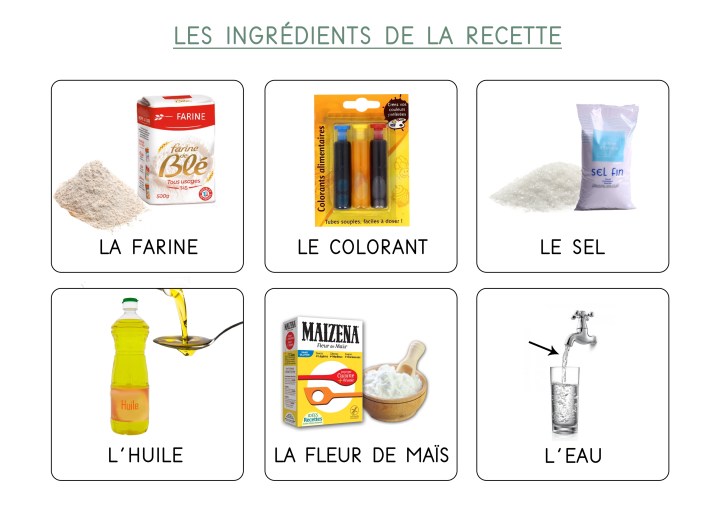 La cuisson doit être réalisée par un adulte. En cette période de confinement, il ne faut pas sortir pour aller chercher les ingrédients. Vous pourrez toujours les acheter si vous devez vous rendre au supermarché ou alors faites avec ce que vous avez. La recette reste un prétexte pour travailler le vocabulaire. la recette de la pâte à sel peut tout aussi bien faire l’affaire.