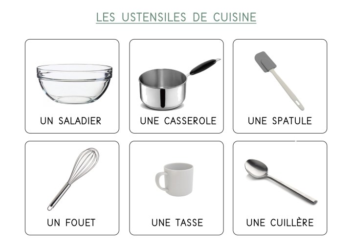 Voici l’imagier avec le vocabulaire des ustensiles de cuisines nécessaires à la réalisation de la recette. Vous devez procéder comme avec l’imagier des ingrédients.