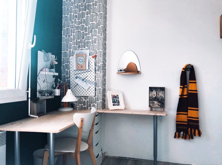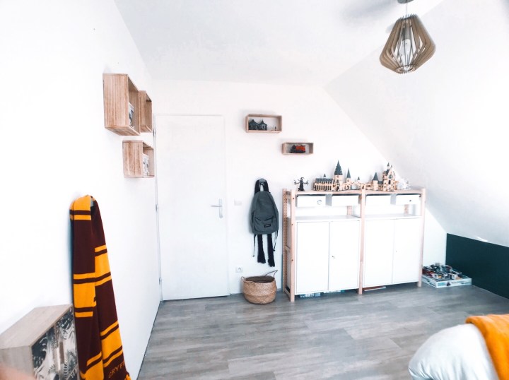 Je pense qu’on a bien réussi à suivre l’inspiration et les envies qu’elle avait pour cette nouvelle déco de vraie adolescente. Les jouets ne sont plus là. Il reste uniquement ses Légos harry Potter dont elle est fan et sa collection de POP uniquement Harry Potter également. Elle a également fait beaucoup de récup pour sa chambre (genre je pique les nouveaux coussins achetés pour la chambre de son petit frère (qui ne s’en rend même pas compte car il s’en moque lui de la déco…), le lustre trouvé à Emmaüs, les tiroirs de mon bureau d’entreprise, notre ancien lit customisé (lit ikéa dont nous avons coupé la tête de lit)…