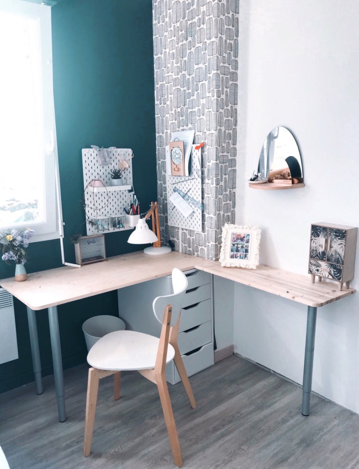 Mon barbu a créé son bureau avec une planche en pin et je l’ai vitrifiée pour qu’elle ne s’abîme pas. Il ne reste que les plinthes à mettre. Après réflexion nous allons les laisser en bois brut pour suivre avec une partie de ses meubles. Les meubles IVAR d’ikéa sont normalement faits pour mettre dans les cellier. Nous avons utilisé ce concept dans la chambre de nos 3 enfants car ils existe aussi bien en acier qu’en bois brut et ils permettent de nombreuses modulations. Nous ne regrettons pas ce détournement.