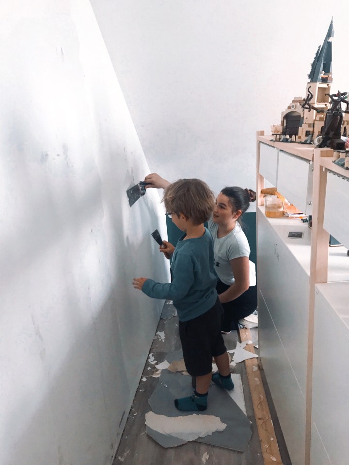 Zélie est très manuelle et elle m’a aidée à repeindre son mur qui était à l’origine violine (oui j’aime ma fille de tout mon cœur car je déteste le violet et elle, elle adorait… mais pourquoiiiiiiii !). J’avoue que ça m’a beaucoup réjoui surtout que j’adore le vert. Les murs étaient forts abîmés et pendant que nous étions occupés avec les travaux du bas (cuisine et compagnie…), Zélie a fait elle-même les enduits de sa chambre (d’ailleurs je me demande si je ne vais pas lui laisser faire ceux de la salle de bain, tellement elle est douée !). Elle a également détapissé le mur face à la fenêtre.