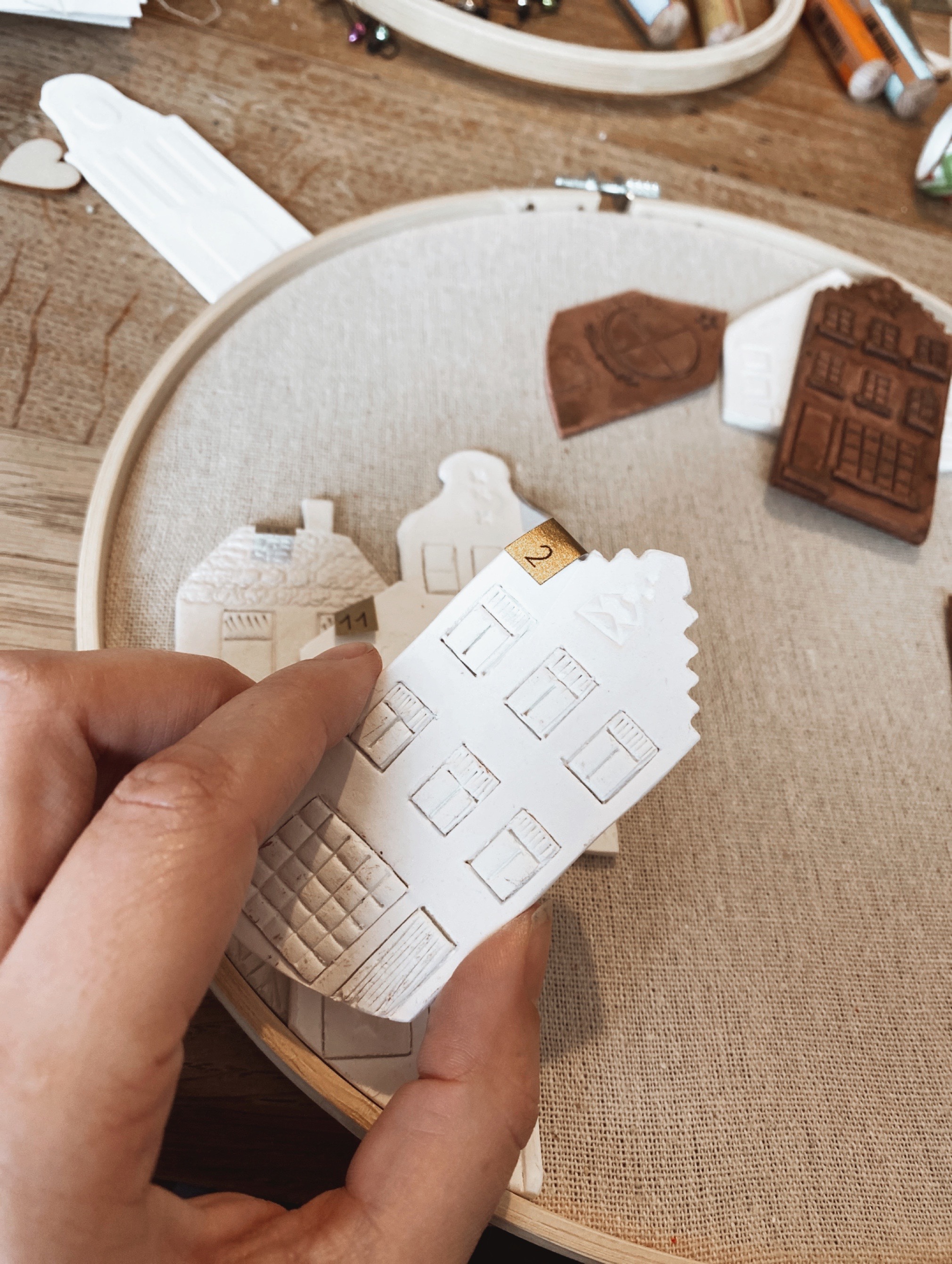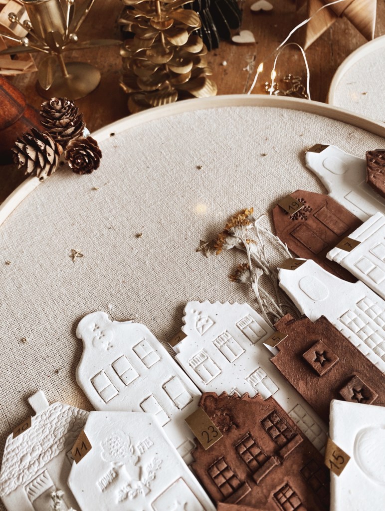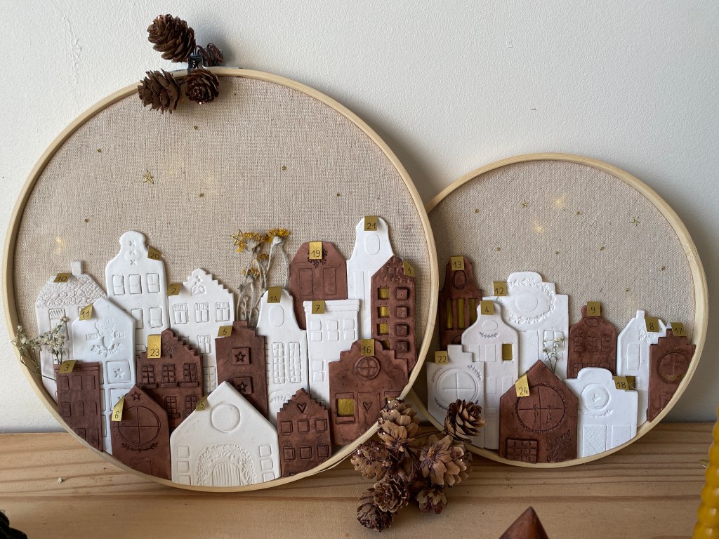 J’ai utilisé du matériel que j’avais à la maison : 2 tambours à broder, du tissu, du fil à broder, de la pâte à modeler durcissante à l’air, un pistolet à colle chaude, du papier doré, des tampons, des fleurs séchées et de petites maisons en papier épais que j’ai créées et que vous pouvez télécharger si vous souhaitez faire le même calendrier que moi.