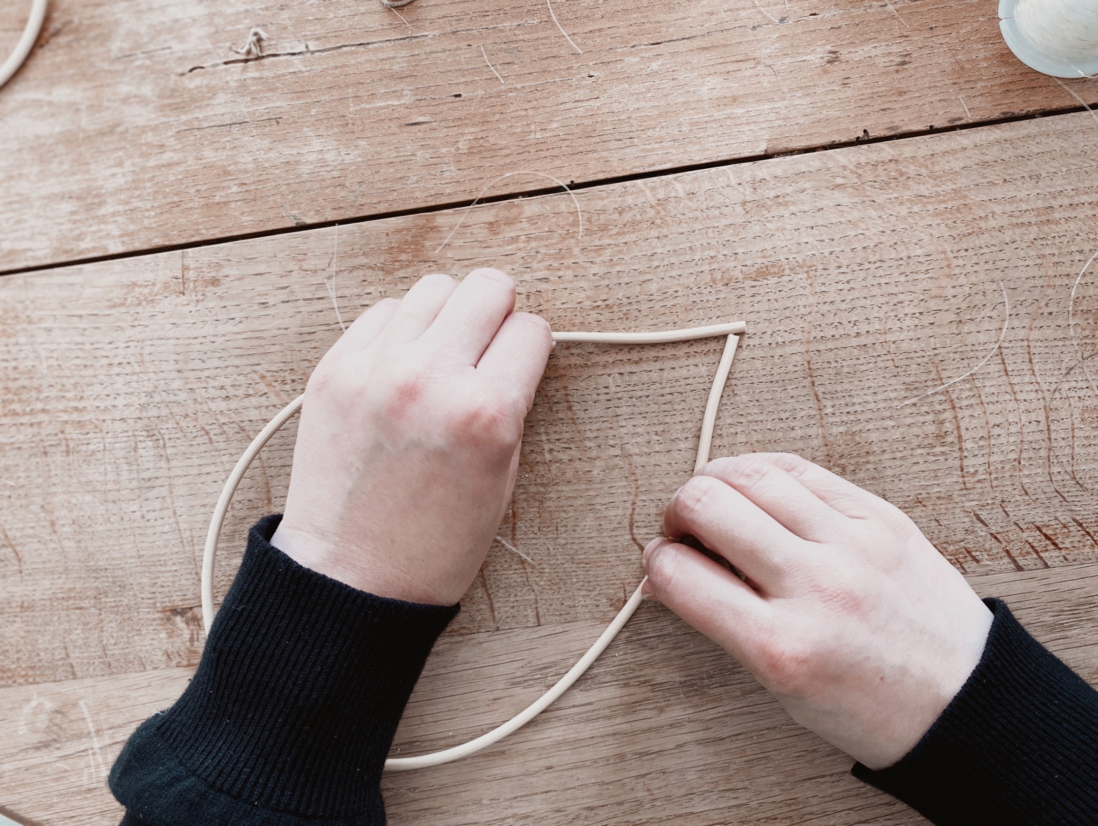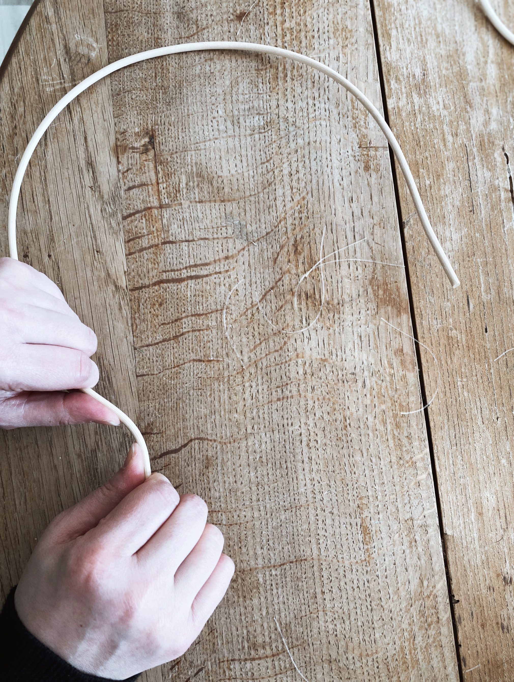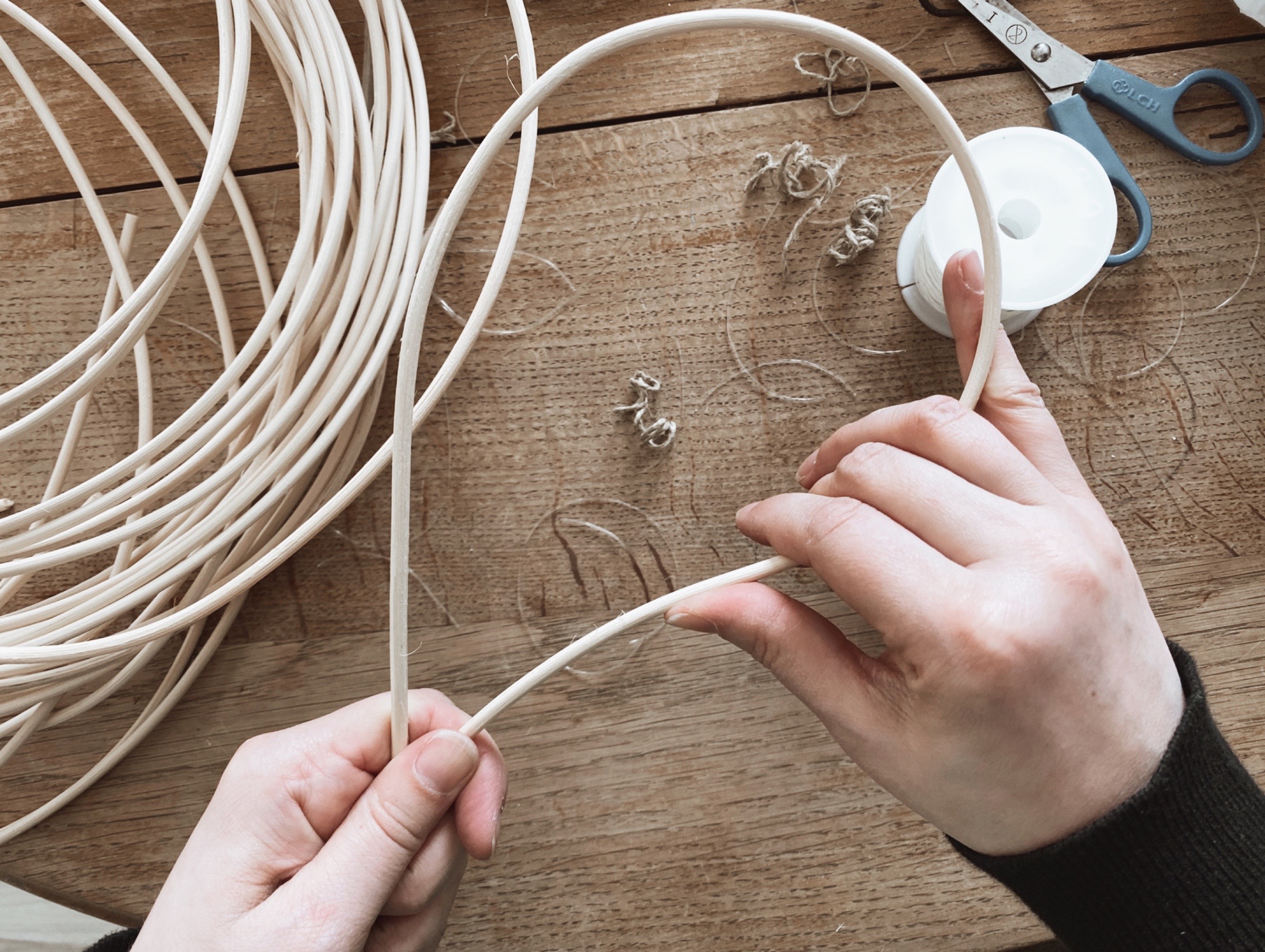 Il faut travailler le rotin. Celui de 4mm est plus maniable, j’ai donc décidé de ne pas mouiller le rotin pour lui donner sa forme. Je l’ai modelé à la main en faisant bien attention de ne pas le casser.