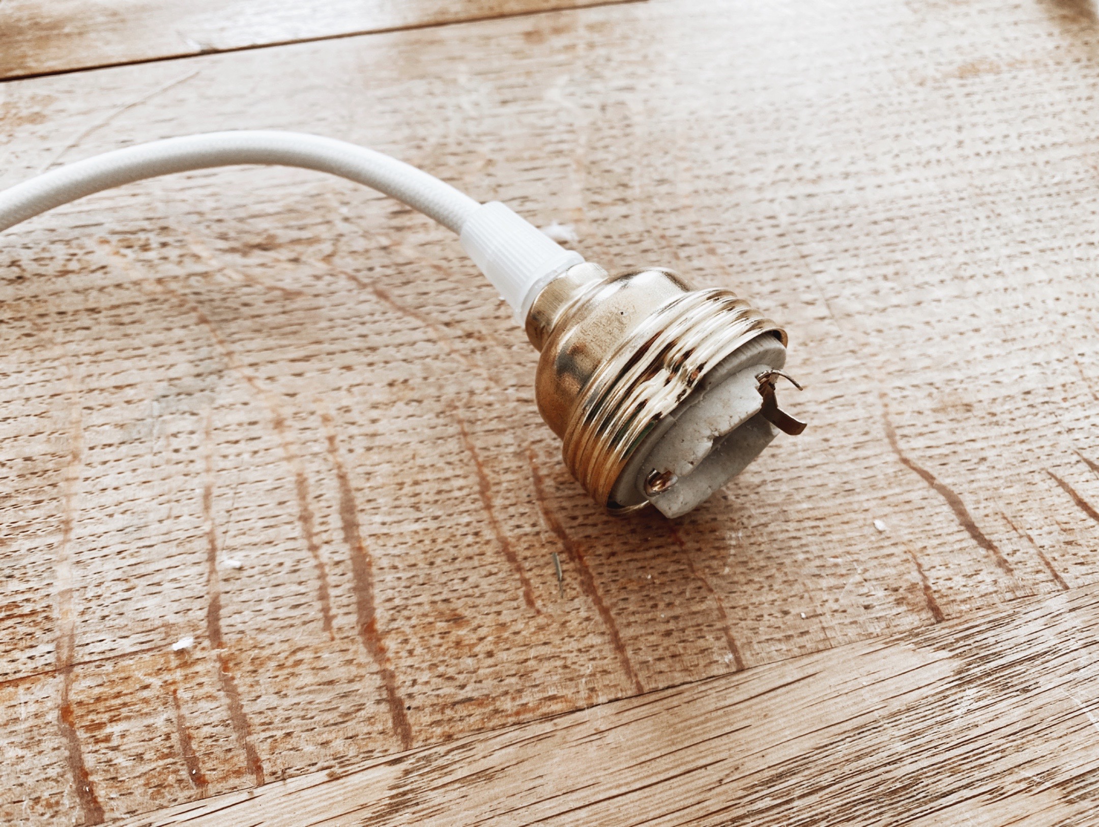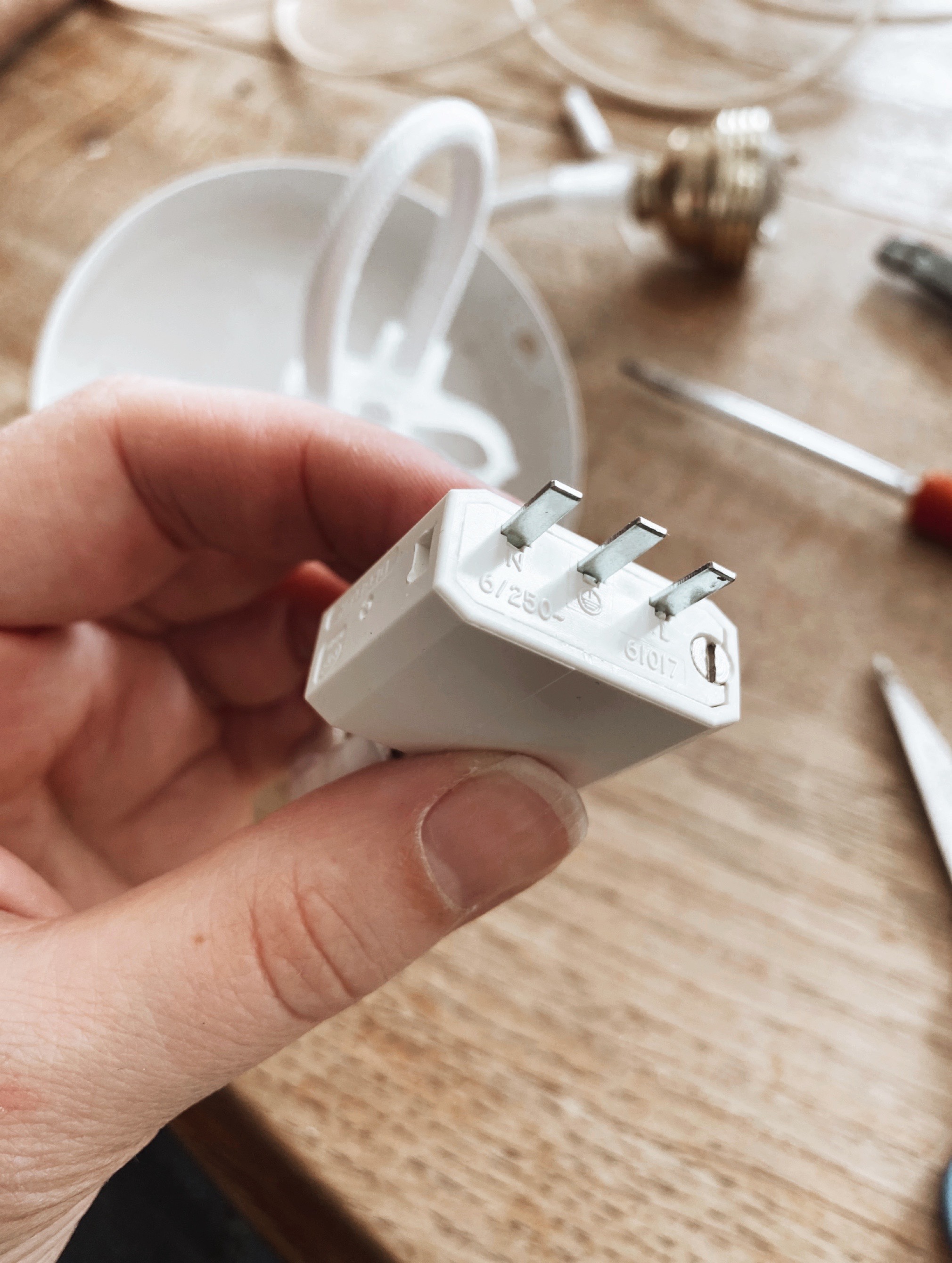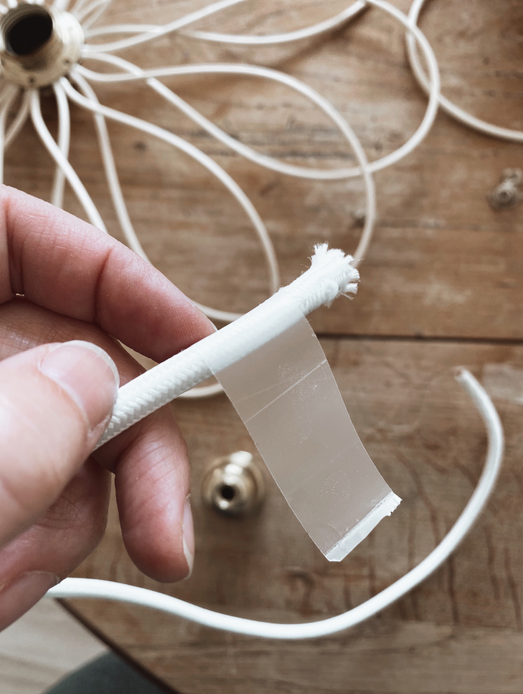C’est le moment d’assembler le luminaire. Je ne suis pas experte en électricité mais voici quelques astuces pour ne pas abîmer le fil tissé : il faut scotcher et brûler avec un briquet pour éviter que le fil ne s’effiloche.