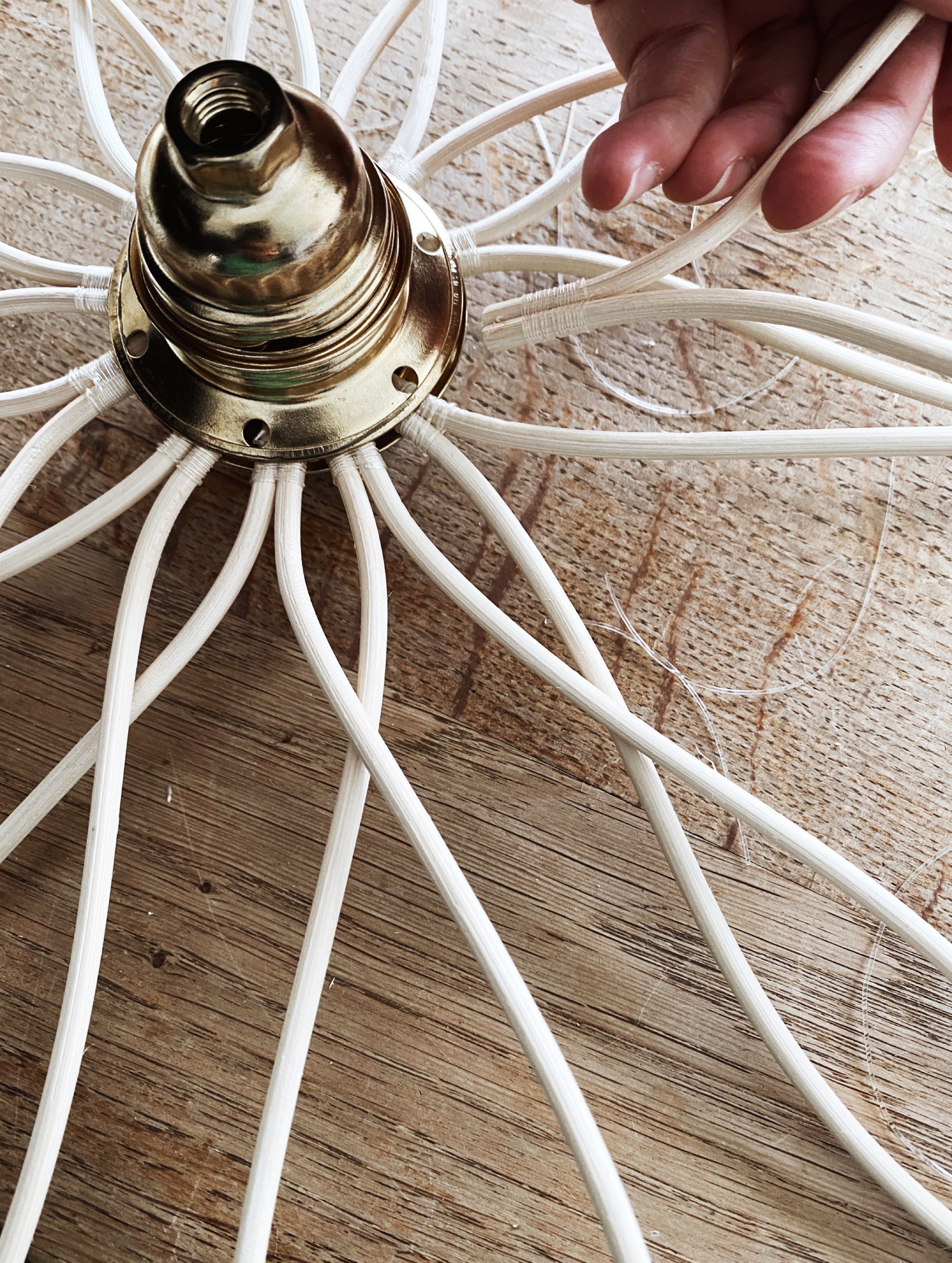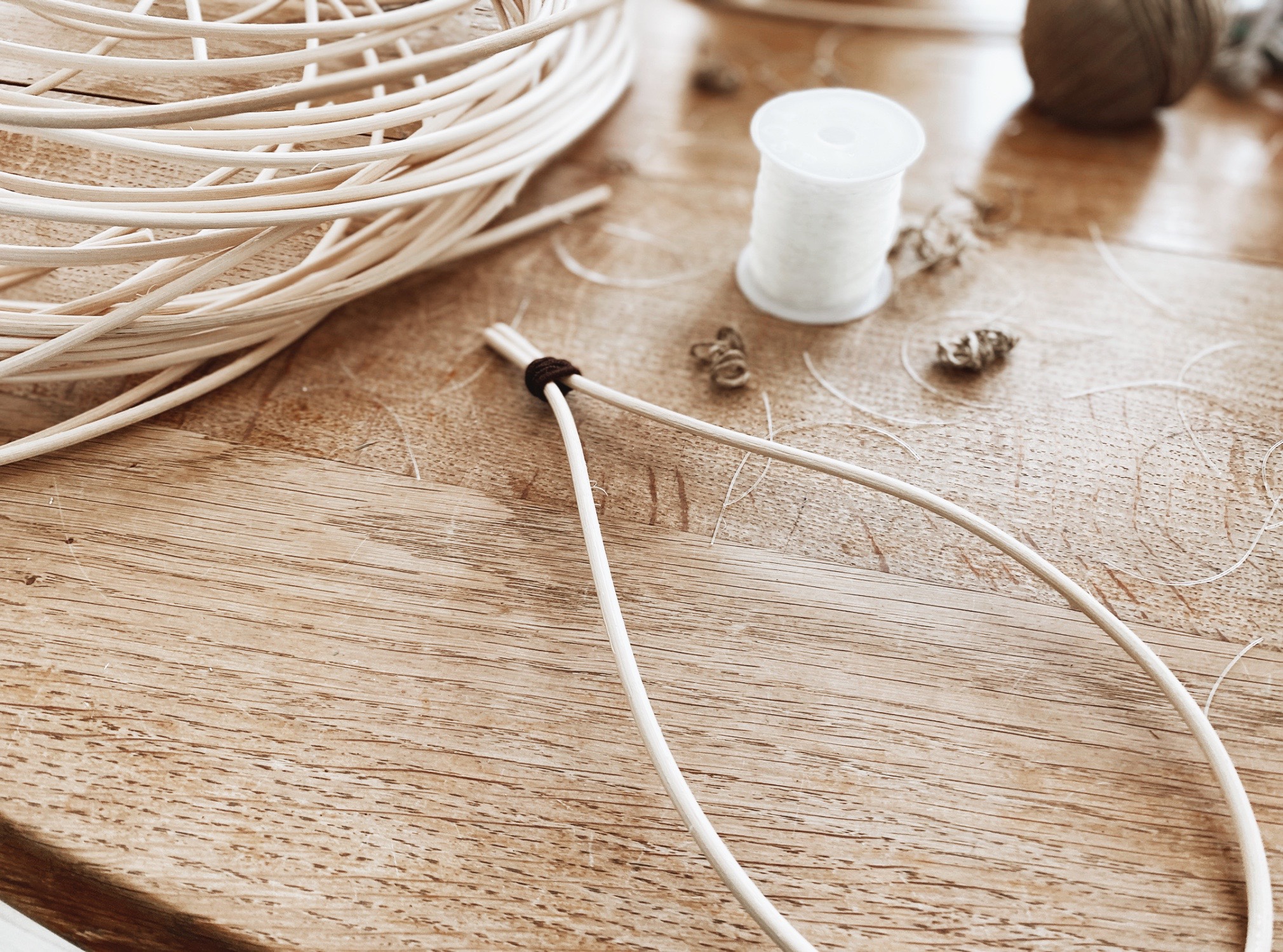• De la moelle de rotin de 4mm de diamètre (j’ai trouvé la mienne sur Amazon…) 20€ les 250g, ce qui permet de faire plusieurs luminaires.