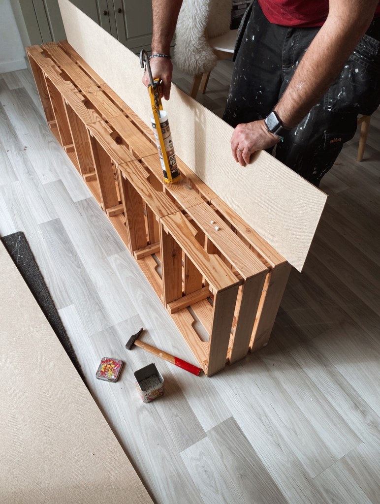 Commencez par vider votre étagère et la poser sur le sol afin de fixer la face latérale avec de la colle et de petits clous.