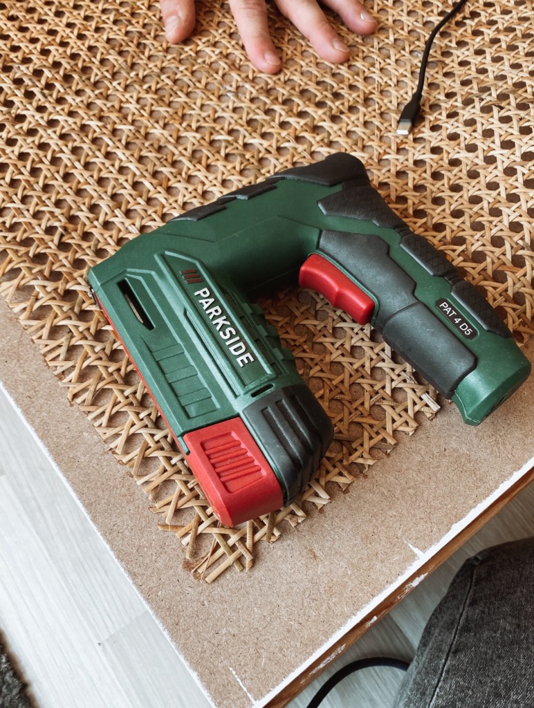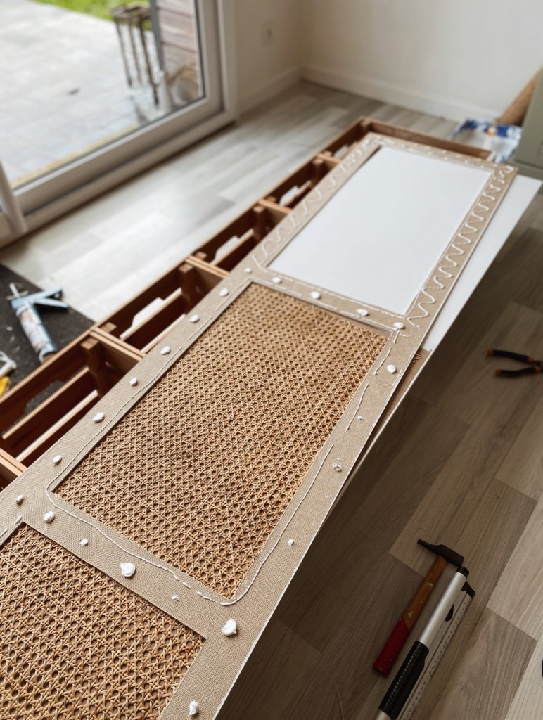 Mettre de la colle sur votre panneau découpé de 3mm et le positionner sur le panneau de 10mm sur la face où vous avez agrafé le cannage.